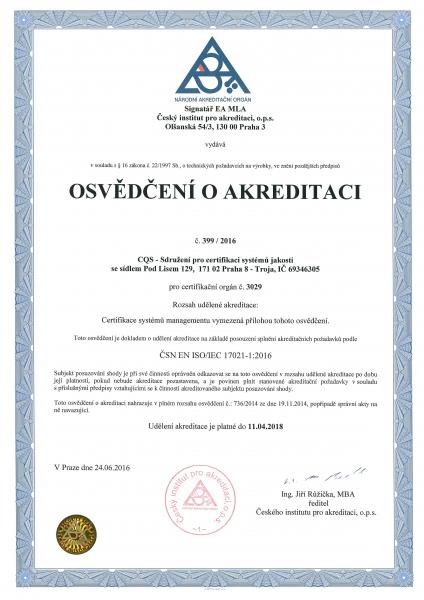 CQS získalo akreditaci na certifikaci systému managementu dle ČSN EN ISO 9001:2016 a ČSN EN ISO 14001:2016