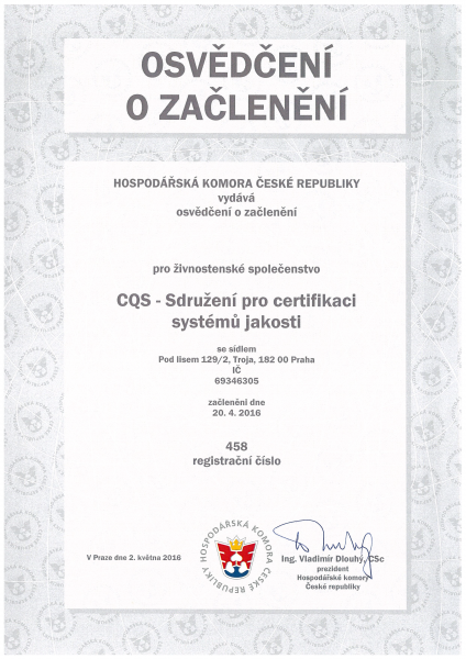 CQS bylo 20.4.2016 začleněno 20.4.2016 do Hospodářské komory České republiky.