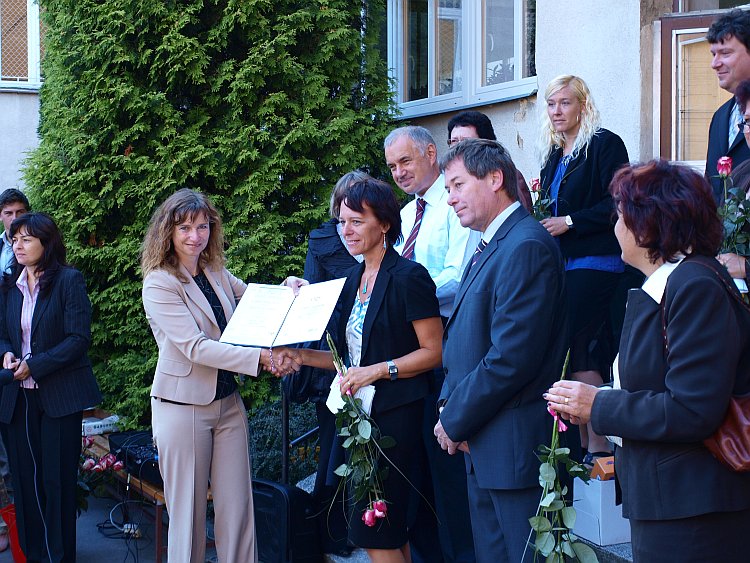 Certifikát od vedoucí certifikačního orgánu CQS Ing. Jany Olšanské přebírá ředitelka základní školy Mgr. Markéta Olbertová. Slavnostního předání se zúčastnil náměstek primátora města Brna pan MUDr. Daniel Rychnovský, starosta městské části pan Ing. Roman Vašina a také zástupce České školní inspekce paní Mgr. Lenka Špačková.