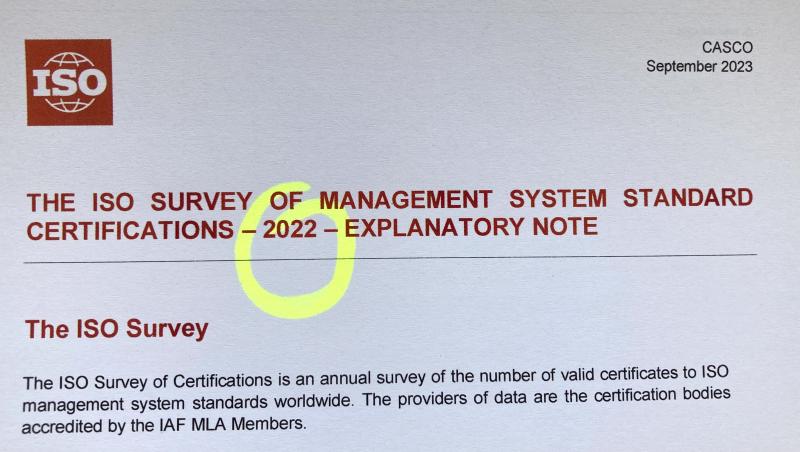 ISO publikovala svůj každoroční průzkum - tedy celosvětový přehled počtu certifikátů systémů managementu - za rok 2022