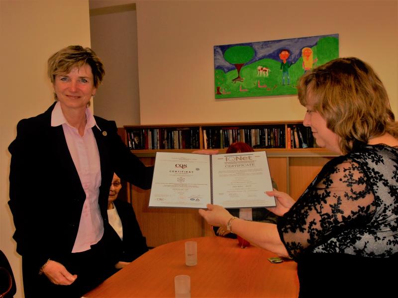 Výkonná ředitelka CQS Jana Olšanská předala certifikát ředitelce školy paní Mgr. Bc. Martině Brhelové. Současně s certifikátem CQS získala škola i prestižní mezinárodně uznávaný certifikát IQNet (IQNet - celosvětová síť certifikačních orgánů). Tento certifikát managementu kvality obdržela jako první v ČR speciální základní škola.