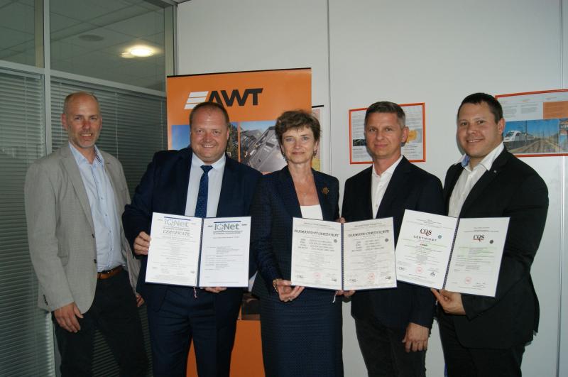 Výkonná ředitelka CQS Jana Olšanská předala „Diamantový certifikát“ předsedovi představenstva panu Macieji Walczykovi za přítomnosti pana Jiřího Minky, člena představenstva, pana Radka Podstawky, ředitele CQ a pana Marka Ptáčníka, vedoucího oddělení TMS a OŽP. Tento certifikát je vydán na základě certifikátů CQS podle norem ISO 9001, ISO 14001, OHSAS 18001 a ISO 50001 pro systémy managementu kvality, životního prostředí, bezpečnosti a ochrany zdraví při práci a hospodaření s energií. Současně s certifikáty CQS získala společnost i prestižní mezinárodně uznávané certifikáty IQNet (IQNet - celosvětová síť certifikačních orgánů). Advanced World Transport a.s. se tak řadí mezi 30 společností, které tento výjimečný „Diamantový certifikát“ obdržely (Diamantový certifikát CQS uděluje společnostem, které mají certifikovány 4 a více systémů managementu)